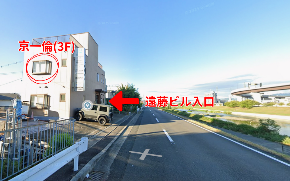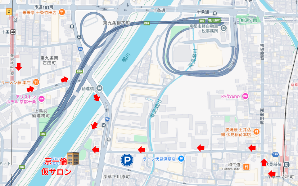 | ※京都駅からお越しの場合はこちらのルート 近鉄電車「伏見駅」より徒歩8分 伏見駅降りると、前の国道を渡り、そのまま、「100円ローソン」の右横の細い道を300メートル進みます。 七差路の交差点に「新門丈橋」という茶色い橋が出てきます。 「京一倫」の表札がでております。 |